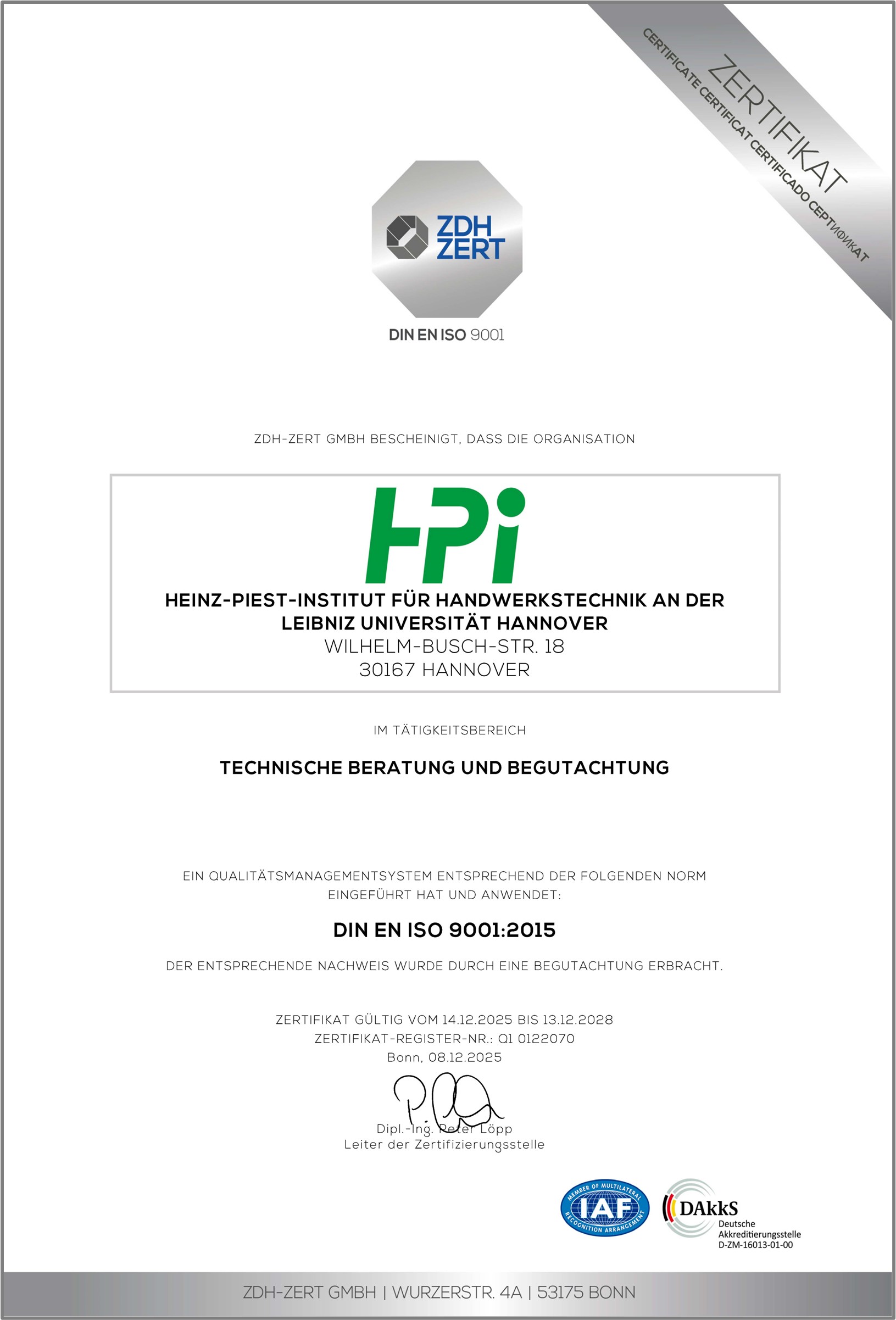 Die Rezertifizierung wurde durch die ZDH-ZERT GmbH durchgeführt und gilt bis zum 13. Dezember 2028.